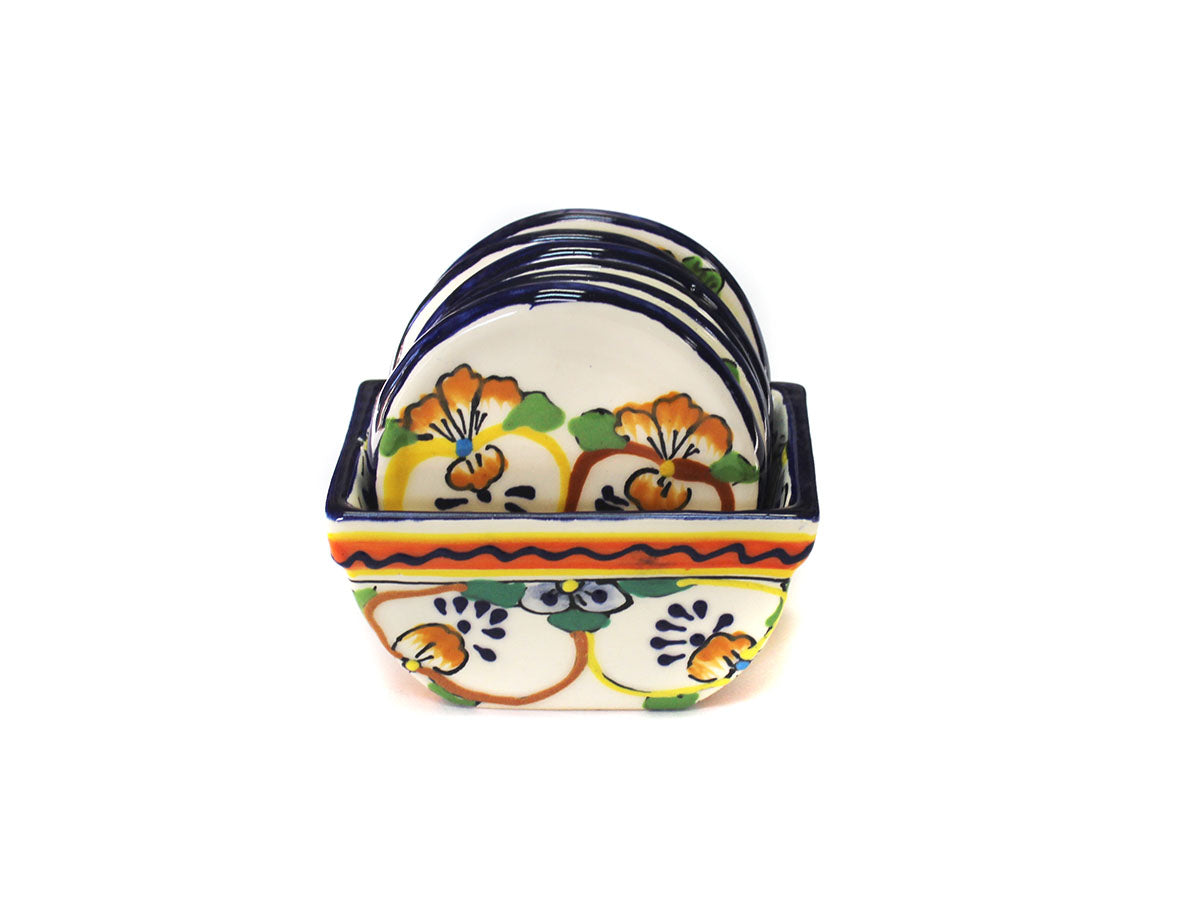With all the colors of Mexican life, this set of coasters is a great addition to any room in the house. Six coasters and holder included.