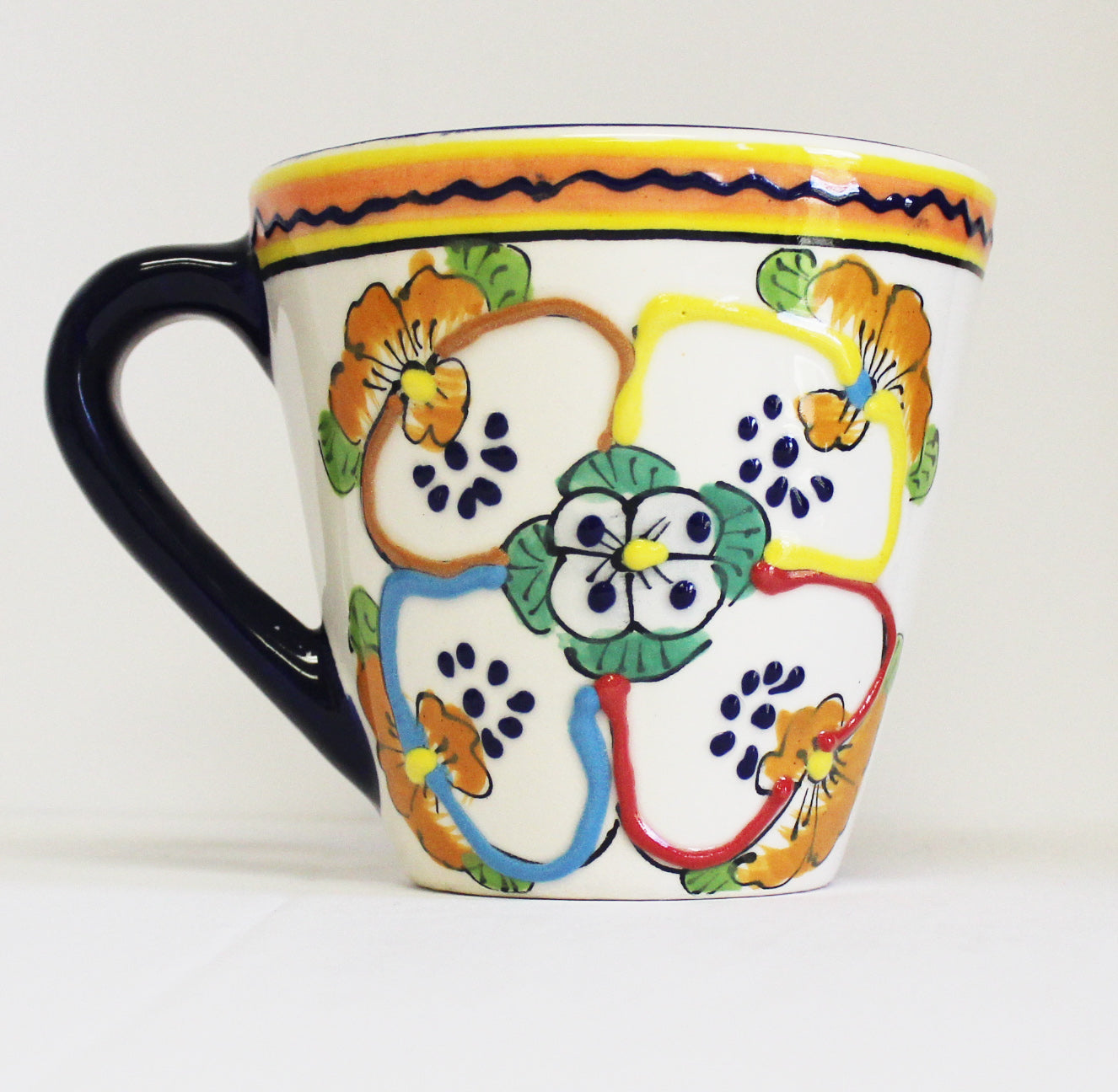 With all the colors of Mexico, this coffee cup is a great size for a large cup of coffee or tea. Can also be used for soup or oatmeal. Lead free and dishwasher safe.