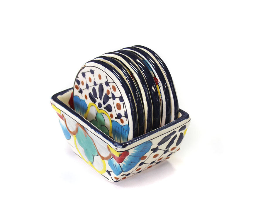 Bring the vibrant colors of Mexico into your home with this set of coasters in a raised relief pattern. Six coasters and holder included. Great gift idea! Lead free and dishwasher safe.