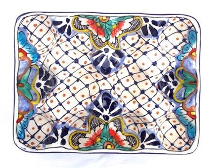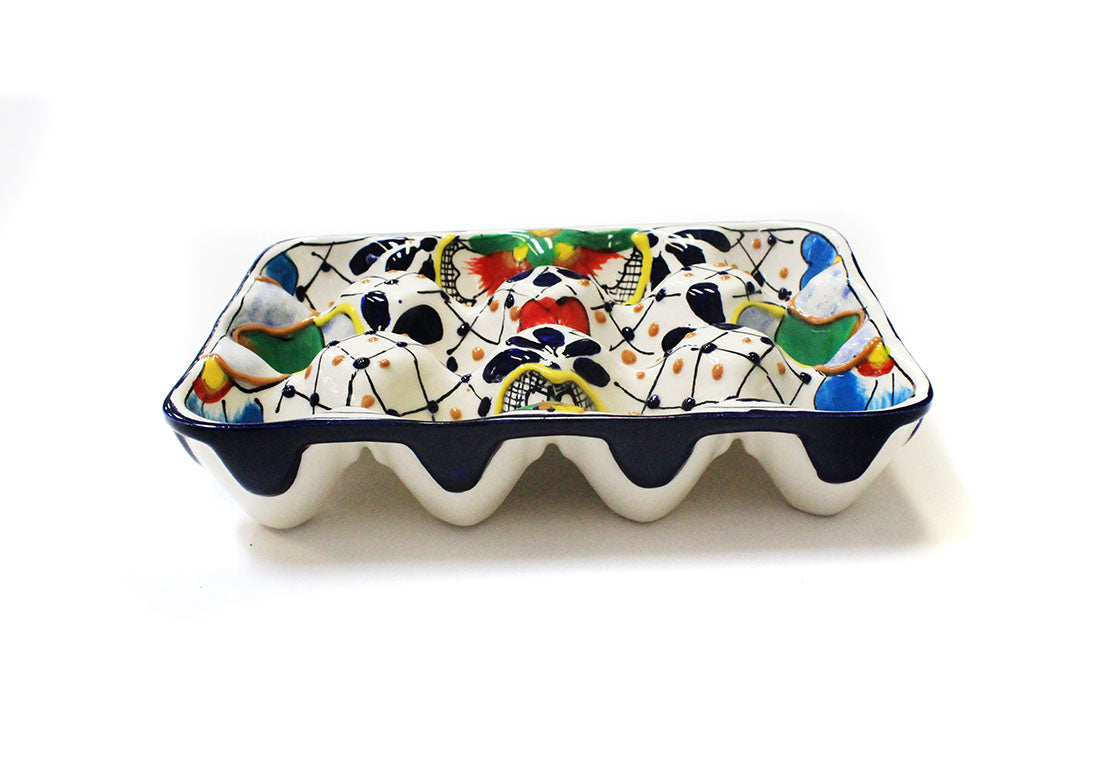 This beautiful egg crate, painted in the colors of Mexico in a raised relief pattern, is a unique way to store your eggs. Makes a great gift! Lead free and dishwasher safe.