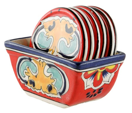 Bring the fiery reds of Mexico into your home with this set of coasters which is a great addition to any room in the house. Six coasters and holder included.