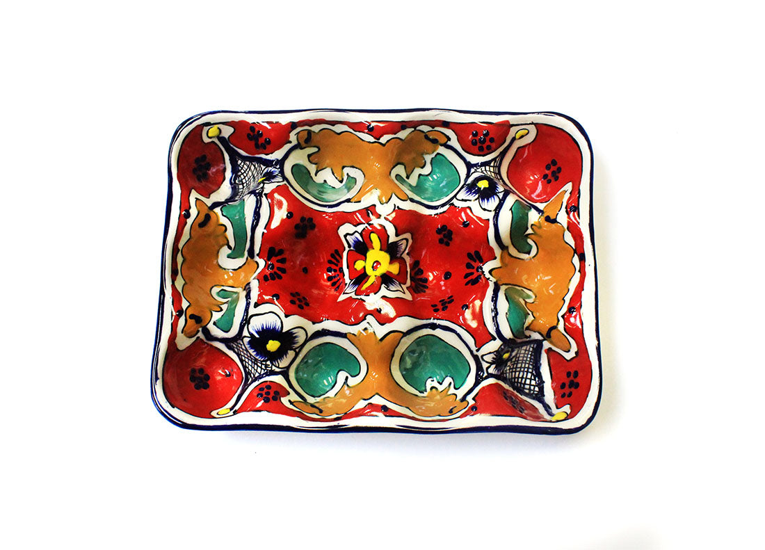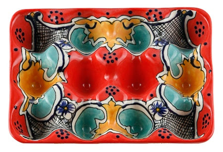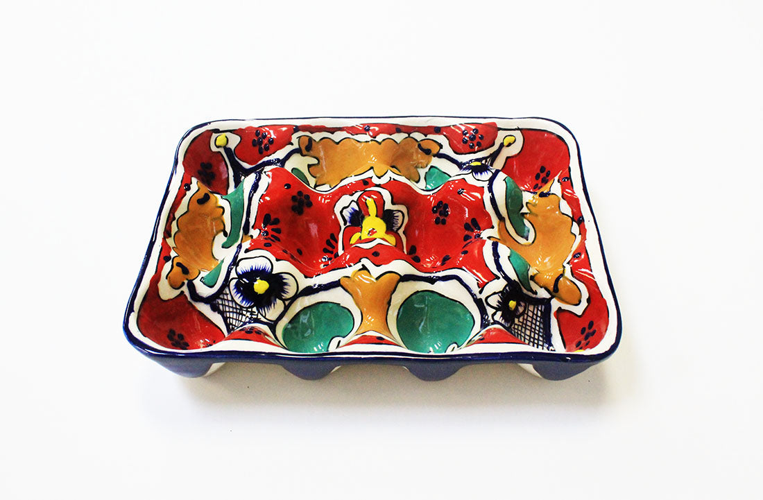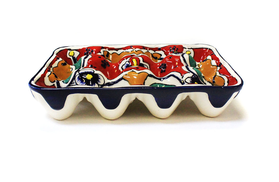 This beautiful egg crate is a unique way to store your eggs.  Painted in a fiery red, raised relief pattern, it is lead free and dishwasher safe. Holds one dozen eggs.